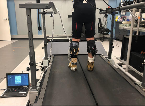 哈佛大学的研究人员利用绑在参与者小腿上的便携式超声波系统为他们的肌肉成像,以测试外骨骼。| 图片来源:哈佛大学生物设计实验室/哈佛大学SEAS