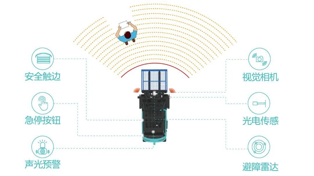 在货物上方(支腿尖端)增加安装避障雷达,结合原车标配光电传感、声光预警、急停按钮、防撞触边等模块,全方位安保护航。