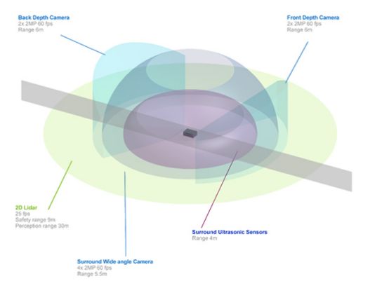 它的两个Jetson AGX Orin单元为感知、导航和人机互动提供了高达550 TOPS的AI计算。这些模块实时处理来自AMR中枢神经系统的数据--基本上是由多达六个摄像头、三个激光雷达和八个超声波传感器组成的传感器套件。