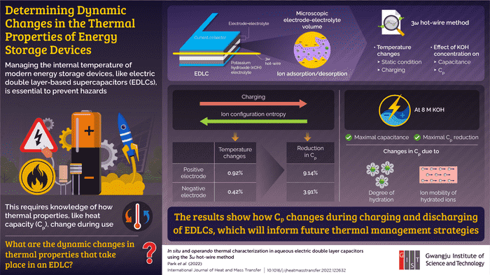 最近,来自韩国光州科技大学(GIST)的研究人员调查了双电层电容器(EDLC)的热特性–一种具有高功率和长寿命的超级电容器,为热测量奠定了技术基础,并揭示了重要信息。领导这项研究的Jae Hun Seol教授解释说:“利用3ω热丝法,我们能够在微观的电极-电解质体积中实时测量EDLCs的热容量变化,该体积是离子吸附和解吸的活跃场所。”