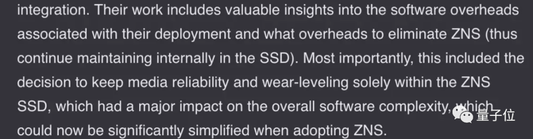 他们的工作对整体软件和部署复杂性有重大影响,他们降低了软件开销,提出了同时保证存储介质可靠、损耗均衡的关键意见,现在在采用ZNS时,可以显著简化一系列复杂性,能让ZNS更容易被使用。