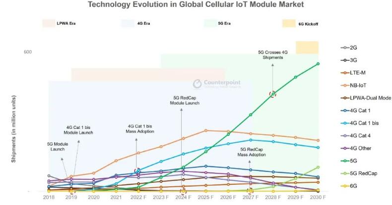 Counterpoint Research分析称,5G蜂窝物联网模块累计出货量(不包括5g RedCap)将达到25亿部,2022年至2030年的复合年增长率为60%。