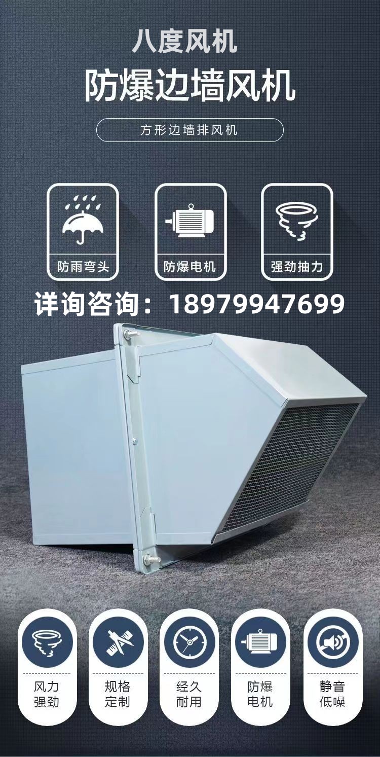 防爆边墙风机大风量(方形壁式)采用先进的前掠型叶片、低噪音的外转子或内转子风机专用电机直联传动,方形外壳设计可以方便地安装在混凝土墙、砖墙或轻钢压型墙板上,方形防雨罩结构牢固,外形美观。具有噪声低、风量大、运行可靠、性能参数范围广、安装简便等特点,广泛应用于厂矿企业车间和民用、商用建筑工程的边墙壁式通风换气。根据输送介质的要求,可制成防腐、防爆型。