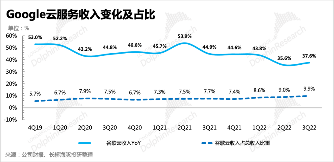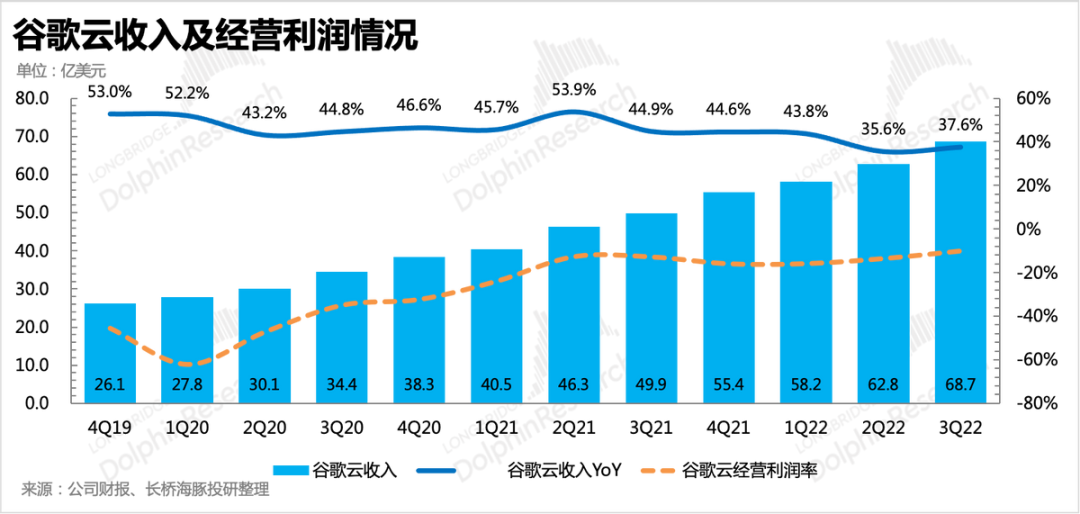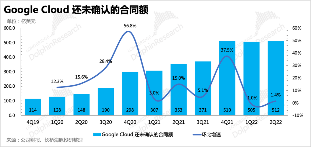 3、云业务超预期,收入加速、亏损改善三季度云业务表现比较出色,收入68.7亿美元,同比增长37.6%,相比二季度的35.6%略有加速。这在大多数科技公司减少资本开支的统一动作下还能维持高增长,除了谷歌云在技术、产品力上的提升以及在消费行业领域的优势外,可能主要还是在消耗存量合同额(需要结合完整季报披露的数据进行确认)。自去年四季度签单了几个长期合作的大客户以来,谷歌云的待履约合同额增幅(最新数据截至2022Q2)开始大幅放缓。但由于每季度确认的云收入增速维持高位,尤其是在当前的环境下,说明谷歌云的产品竞争力也并不弱。不过海豚君还是要提一下未来的风险,在经济压力下,除了拓展新客户吃力,已签单的客户也可能会通过减少使用量来降低资本开支。对应到谷歌云上,会表现为虽然存量合同很多,但确认周期被拉长,还是会拉低云收入的增速。