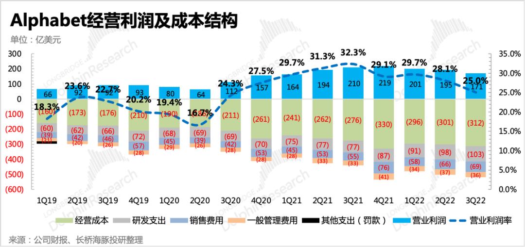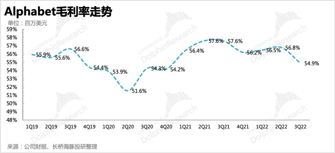 2、支出项还未收缩,利润率大幅走低。虽然此前有新闻报道,考虑到宏观经济的逆风,谷歌放缓了招聘。但从三季度财报中来看,并未看到明显的收缩动作落地,截至三季度末员工人数比上季度增加了近1.3万人,同比增长25%。除了成本小幅增加外,三项经营费用仍然在高速扩张中。最终造成毛利率、经营利润率均环比大幅走低,但主要恶化的部分还是以广告收入为主的谷歌服务业务上,谷歌云亏损情况在逐步改善。
