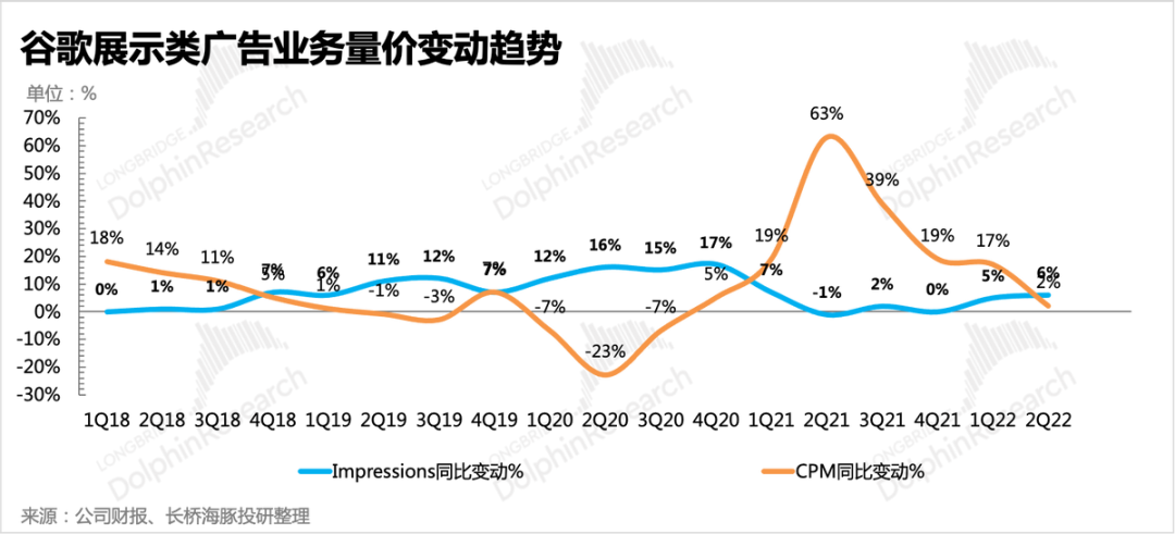 从第三方数据来看,YouTube的电视用户时长占比是在增加的,也就是说供给上广告库存并不是问题,但最终收入表现不佳,恐怕主要受CPM走低影响,这在前两个季度的变化趋势已经有所体现。CPM走低往往与广告主的投放需求相关,背后则代表着商家对经济的前景预期并不乐观。