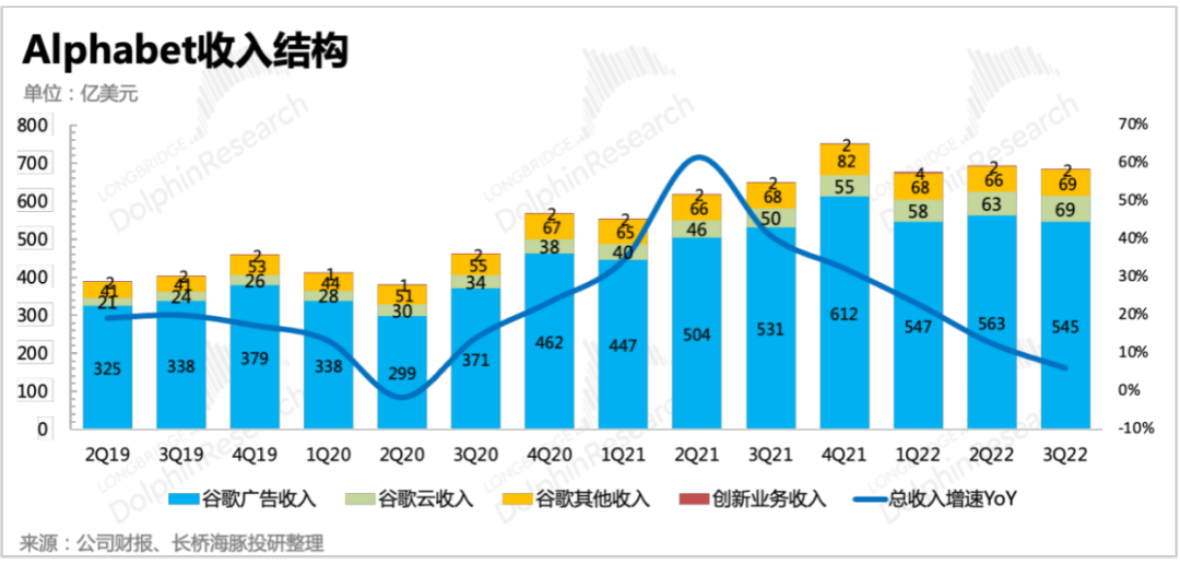 1、收入崩了,广告加速踩刹车。在经济衰退预期、竞争加剧以及对苹果IDFA政策对YouTube广告的影响下,谷歌广告业务的压力继续加强,整体增速落至3.3%,其中除了搜索广告维持4.3%的正增长外,YouTube广告、联盟广告均开始下滑。尽管谷歌云超出市场预期,增长加速,但受占比近80%的广告业务拖累,再加上汇率变动对国际收入不利,总营收仅维持6%的增长,低于市场预期(yoy 9%)。