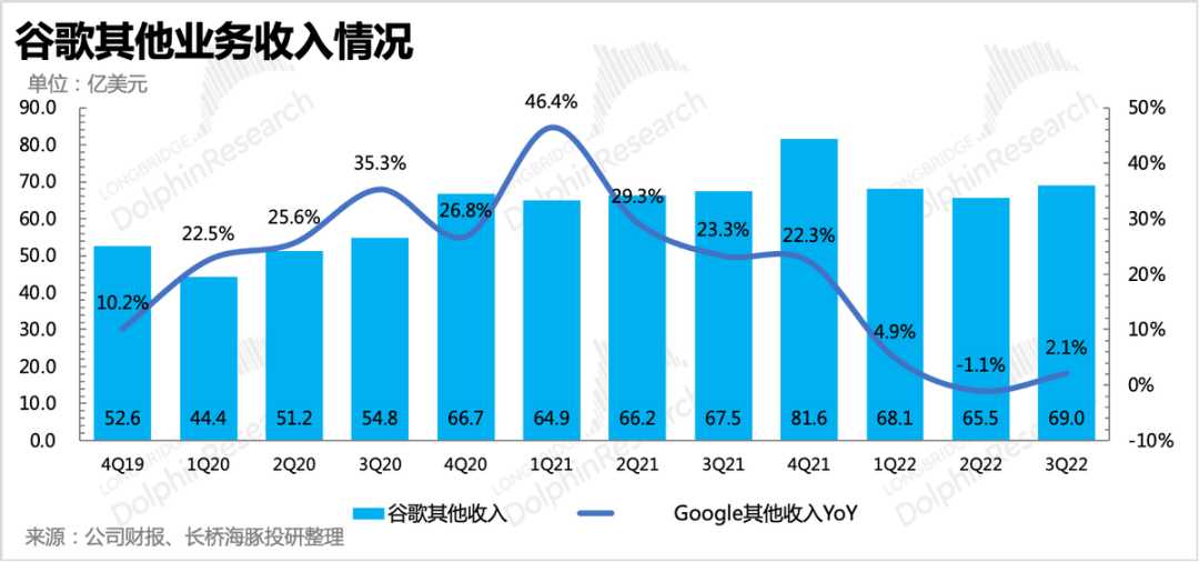 4、其他谷歌服务主要包括Google Play、YouTube订阅、智能硬件收入。三季度共实现收入69亿美元,同比增长2.1%。前两个季度增速已经快速下滑,Google Play走弱是主要原因,一方面是全球游戏收入下滑,另一方面则是年初开始调整的分成比例,由30%削减至15%,部分软件开发商享受更低的10%优惠。另外,7月发布的 Pixel 6A,销量超预期,尤其是在日本地区,成为日本最热卖的安卓机。