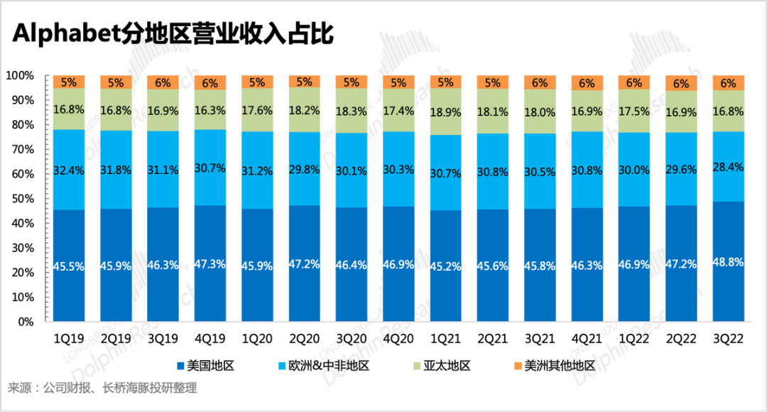 经济下行期,广告股并不是优选,尤其是在面对今年这种涉及多因素混合影响下的高度不确定时期。虽然从最近几个月的经济数字来看,美国的消费需求还是超出市场意料的强劲,但广告主的预期是跑在最前面的,衰退风险还是提前让广告主收紧了预算。更何况,北美之外的其他地区,宏观环境更差,但贡献了谷歌50%以上的收入,因此影响拖累也是非常明显。