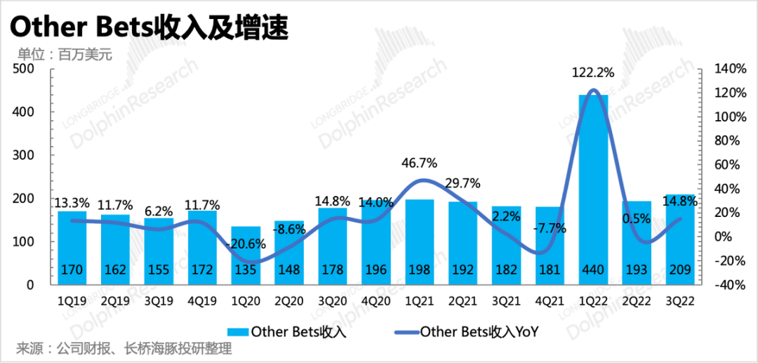 5、创新业务包含了多个创投项目,取决于谷歌对各个项目的前景判断,开设和关闭也会相对频繁,因此整体收入一直波动较大,但在整体收入中占比很低,因此它的剧烈变动对于谷歌短中期的业绩判断影响不大。三季度创新业务收入同比增长15%,共2亿。但近期有媒体报道出于对宏观环境和项目前景的考虑,谷歌正在关闭多个创新项目,预计很快会看到规模收缩。