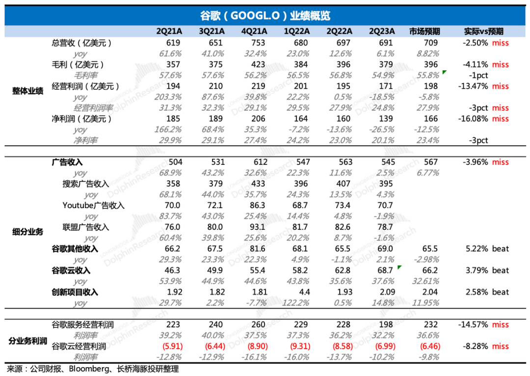 2、占比超80%的广告收入快速降温,是拖累主因。细项中,YouTube广告、联盟广告均负增长,搜索广告收入因为服务型消费相对强劲以及受益苹果IDFA政策而获得的广告份额迁移,增速勉强收正,三种广告业务均不及投行的预期。