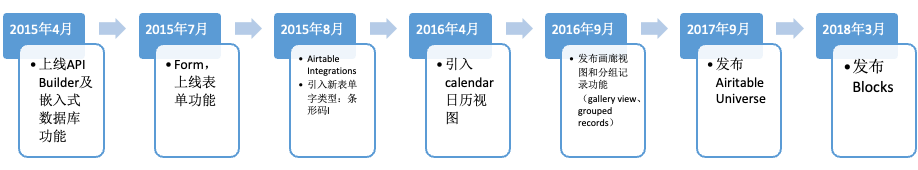 所以从这个角度来看,Airtable不仅仅是新型的电子表格或者数据库,反而更像是一个项目或数据管理工具。也就是说,云表格并不是Airtable所期望的最终解,它的受众不仅是个人用户或者用来弥补中小企业数字化的漏洞,在线化也远不足以支撑起整个企业的天花板。显然,Airtable也意识到了这点:从2015年开始,为了融入更多的资金,Airtable在产品功能上进行了一系列的更新和迭代。