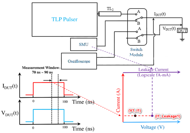 1.使用TLP pulser发出脉冲,使用示波器和对应的探头、测试线缆、衰减器等测试DUT端对应的电压电流,描绘响应的曲线。TLP Pulser打出指定电压V1的脉冲,示波器记录下电流I1。