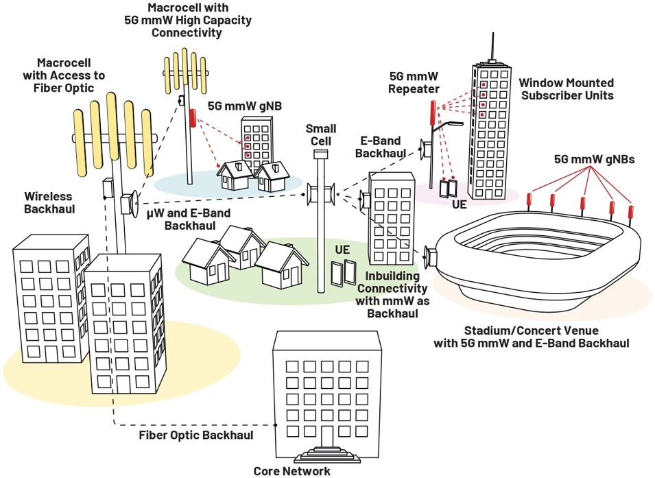 那么,为何过去没有在网络中大量使用E频段呢?在4G网络中,考虑到可用带宽容量,mmW回程技术并未得到充分利用,只有某些场景才会用到,因此大多数无线回程是使用许可的μW频段(6 GHz至42 GHz)实现的。随着5G网络的爆炸式部署和密集化,情况发生了变化,现在需要10 Gbps或更高的回程能力。