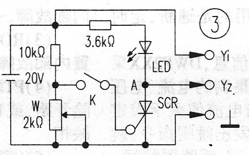 测试方法:示波器输人耦合开关置“DC”挡,Y轴衰减开关置5V/cm。当开关K未闭合时,控制端未加控制电压,则SCR不导通,回路电流几乎为零,示波器屏上显示的A点压VA≈20V。合上开关K,调节电位器W的阻值(由小到大),直到可控硅导通为止,此时发光二极管LED亮,VA急剧下降(可控硅导通后的VA≈0.7V)。此时断开开关K,则SCR继续导通,LED仍亮,屏上显示的电压仍保持在0.7V左右,若要SCR截止,只有切断电源才行。