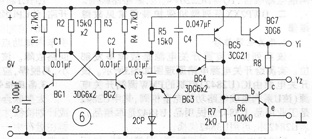 电路图中的BG1、BG2、R1~R4、C1、C2等组成多谐振荡器,BG3~BG5、C3、C4等组成阶梯波发生器,详细工作原理读者可自行分析,这里就不一一赘述了。