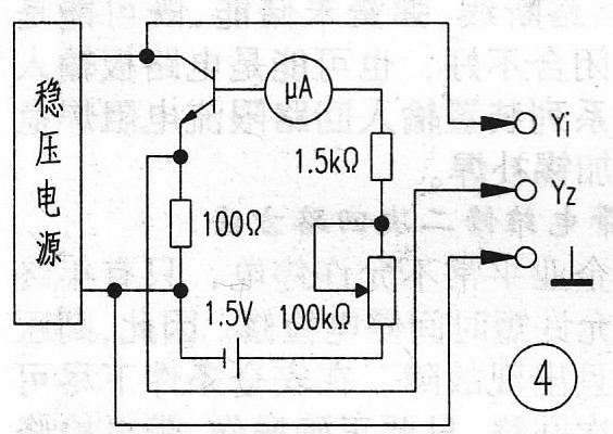 测试方法:把图4连入示波器,从图中可以看出:X轴通道信号反映了集电极、发射极偏置电压的大小,Y轴通道的信号反映了该电路中三极管Ic的变化,示波器耦合开关置“DC”挡。断开1.5V电源,Ib=0,则示波器上出现—条水平亮线。通入1.5V电源,调整100kΩ电位器值的大小,分别使Ib为20uA、40uA、 60uA、 80uA, 则示波器屏幕上将依次扫描出四条曲线,如图5所示。由此可以很方便地测出该晶体管的直流放大倍数,并从曲线的线性度上判别管子的优劣程度。