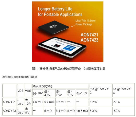 AON7423:AOS推出高功率密度、高能效的功率MOSFET用于便携式应用