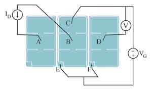 图2显示了测量的结构。3个MOSFET和6个探针均在图中显示出来,电接触则示意性地画出。中间的MOSFET是待测器件。