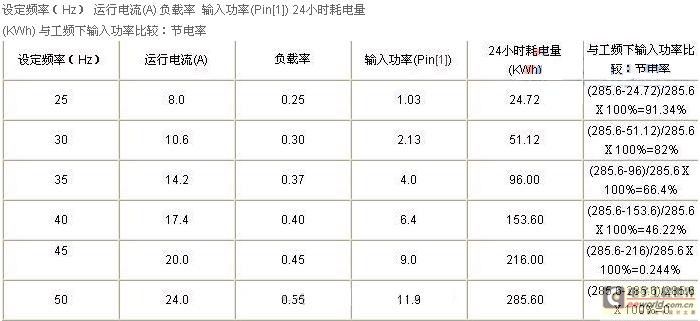 针对这一特殊要求制定方案,对其中两台对开电机进行开环变频调速控制,配合两台全速风机,即满足不同材料的温控要求,又能节约电能。按照这一方案进行改造后,节电效果非常明显。针对其中一种材料需固定频率控制进行冷却,几个月才换一次,设定频率在25—35之间,完全满足冷却要求。工频下运行时一台18.5KW风机(经变频器输出),每小时耗电为11.9度/小时,日耗电量为:285.6度/24小时。在正常运行时根据不同材料的温度要求,设定频率分别为:25Hz、30 Hz、35 Hz、40 Hz和45 Hz。运行测定参数如下: