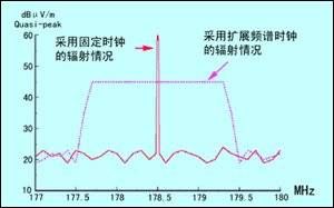 所谓的“扩展频谱时钟”是一项能够减小辐射测量值的新技术,但这并非真正减小了瞬时发射功率,因此,对一些快速反应设备仍可能产生同样的干扰。这种技术对时钟频率进行1% ~ 2% 的调制,从而扩散谐波分量,这样在CISPR16或FCC发射测试中的峰值较低。所测的发射减小量取决于带宽和测试接收机的积分时间常数,因此这有一点投机之嫌,但该项技术已被FCC所接受,并在美国和欧洲广泛应用。调制度要控制在音频范围内,这样才不会使时钟信号失真,图2是一时钟谐波发射改善的例子。扩展频谱时钟不能应用于要求严格的时间通信网络中,比如以太网、光纤、FDD、ATM、SONET和ADSL。