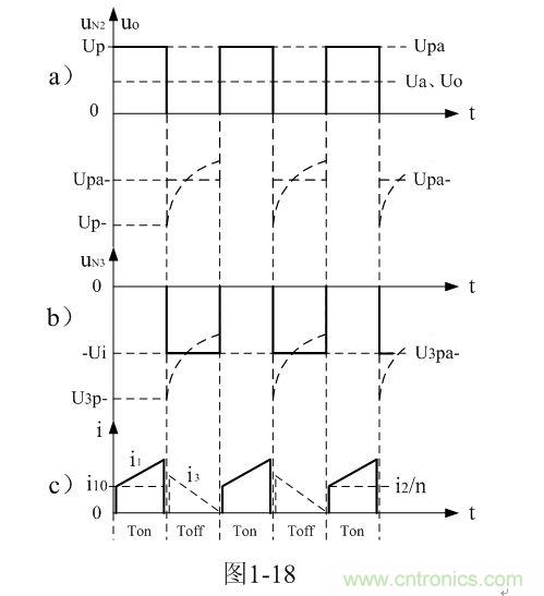 图1-18-c)是流过变压器初级线圈N1和次级线圈N3的电流波形,其中,实线部分是流过变压器初级线圈N1的电流波形,虚线部分是流过变压器次级线圈N3的电流波形。