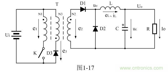 图1-17是正激式变压器开关电源的简单工作原理图,图中,Ui是开关电源的输入电压,T是开关变压器,N1、N2、N3分别为开关变压器的3个线圈绕组,e1、e2、e3分别为3个线圈绕组产生的感应电动势,K是控制开关,D1是整流二极管,D2是续流二极管,D3是削反峰整流二极管,L是储能滤波电感,C是储能滤波电容,R是负载电阻;uo为整流输出电压,或滤波输入电压、eL为储能滤波电感产生的感应电动势、iL为流过储能滤波电感L的电流、Uo为滤波输出电压、Io为流过负载的电流。