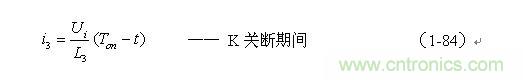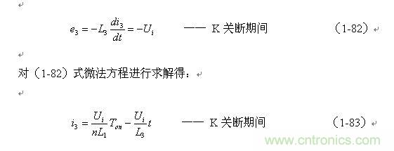 (1-83)式中右边的第一项就是流过变压器初级线圈N1绕组中的最大励磁电流被折算到次级线圈N3绕组中的电流(最大值),第二项是i3中随着时间变化的分量。其中n为变压器次级线圈N3与初级线圈N1的变压比,或匝数比。