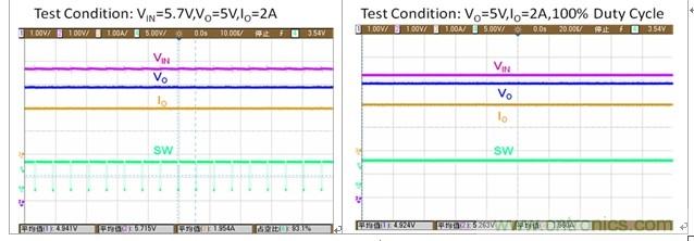 取VIN=5.7V,VO=5V,IO=2A,VD=0.3V, Rdson=50m?, DCR=70m?, 可以计算所需要的占空比为: