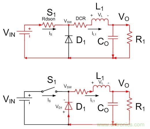 图3. 考虑寄生参数的非同步Buck 电路工作原理