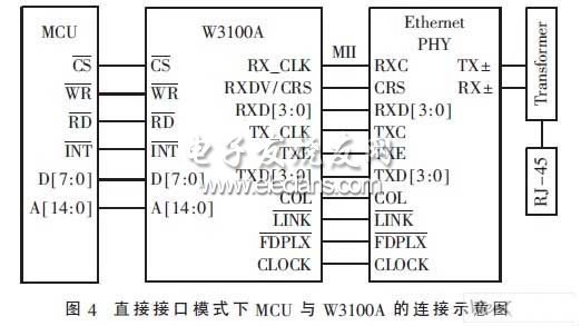 W3100A芯片提供了直接总线模式(Direct Bus I/F)、间接总线模式(Indirect Bus I/F)和I2C总线模式(I2C Bus I/F)三种不同的接口模式与MCU相连接。为了提高数据的网络传输速率,本设计采用直接总线模式和时钟工作模式。单片机与W3100A的硬件连接示意图如图4所示。