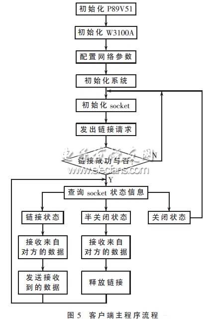 对于W3100A,可配置成客户端,也可配置成服务器端。W3100A的客户端工作模式与服务器端工作模式基本相同,不同的地方是,只要把客户端工作流程中发起链接请求处改成侦听链接请求,则客户端工作模式就变成了服务器端工作模式。本设计中把W3100A配置成客户端,在建立起与PC服务器的连接后,就可实现数据的发送和接收。整个过程的建立基于TCP协议。客户端主程序的流程如图5所示。从客户端主程序的流程可以看出,客户端的工作过程包括初始化、建立链接、收发数据和终止链接四个步骤。在所有初始化及参数设置完成以后,就可发起链接请求。若链接失败,则返回重新执行SOCKET初始化程序。若链接成功,程序将读取Socket状态寄存器的内容,判断SOCKET所处的状态,然后,根据SOCKET所处状态的不同进行相应的处理。整个TCP/IP的工作过程都是建立在W3100A的中断机制基础之上。