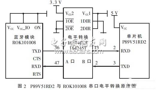 在本设计中,所选用的单片机P89V51RD2是+5 V供电,ROK101008是+3.3 V供电,需要进行电源变换。电源变换电路比较简单,采用电源变换芯片AMS1117-3.3即可。至于逻辑电平转换,可在P89V51RD2与ROK101008之间接入IDT公司的电平转换芯片IDT74FCT164245T,其连接示意图如图2所示。