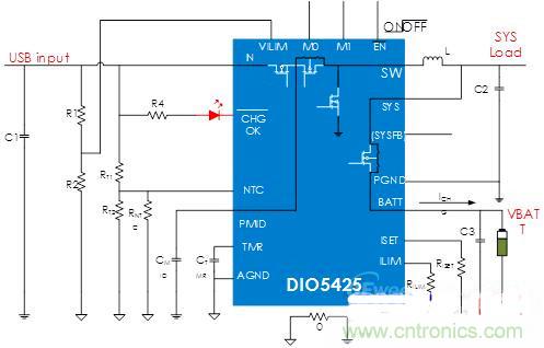 图1:DIO5425参考设计电路锂离子电池充电管理芯片必须具备以下几点特性: