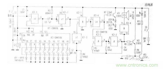 同理,由于IC3的Y2、Y3外接开关也是断开的,因此在第2、3次扣动板机SI时,也会产生象第1次扣动板机时的射击效果。3枪过后,第4次扣动板机S1时,IC3的Y4=1,由于其外接开关是闭合的,所以IC1-3⑧、⑨脚经导通的二极管VD5获高电平,IC2-1②脚为0,虽然在0.5s定时时间内IC2—1①脚为1,但其③输出1,IC1-4(11)脚为0,LED1、LED2、LED3、BL1均不丁作,即此次射击无效。同理,由于IC3的Y4—y9外接开关也是闭合的,所以此后扣动板机射击仍无效。