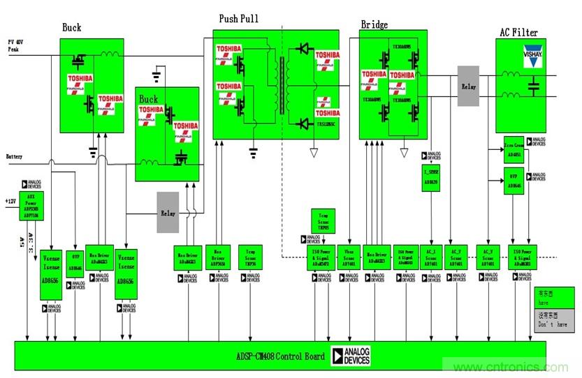 为光伏而生的处理器:ADSP-CM408 是 ADI 公司专门为光伏应用而开发的一款DSP ,它不仅具有传统 DSP 的高处理性能,同时有更高的采样精度,内部固化的电能计量芯片,更是为开发者省去了不少编写软件的工作。同时,它内部的谐波分析引擎能方便的进行有功、无功功率的计算。•磁隔离技术的应用:替代了光伏行业传统的光耦隔离,在电流检测、MOSFET驱动、通信、系统电源方面都有合适的产品。为光伏逆变器的设计提供的更可靠的稳定性和更长的使用寿命。同时,可多功能集成的磁隔离产品为系统节省了更多的PCB面积。•安规认证:伴随着光伏市场的规范化与成熟化,安规认证也越来越成为了产品出口的必要条件。ADI 磁隔离产品均通过了 UL、VDE、SAA、TUV 等认证,ADI 可为客户提供有安规保证的产品。•高效率功率器件:采用东芝超低 Rds(on) 功率 Mos 及 SiC 整流二极管。