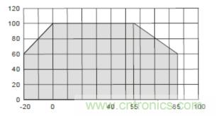 表1:PF值对比2)产品寿命的提升电源本身是一个功率器件,在正常工作时功率损耗通过热的形式散发到外部,其内部的变压器、开关器件、整流二极管等都是发热器件。除内部因素外,大部分电源需应用在较高的环境温度中,这些都会导致电解液的挥发,降低电解电容的使用寿命。陶瓷电容采用特性最稳定的陶瓷材料作为介质,特别是一类陶瓷电容(NOP) 能实现-55℃~+125℃的工作环境温度,容量变化不超过±30ppm/℃。电容温度变化时,容值很稳定,即具有温度补偿功能,适用于要求容值在温度变化范围内稳定和高Q值的线路以及各种谐振线路中;二/三类陶瓷(X7R)实现-55℃~+125℃的工作温度范围内,容量最大的变化为 ±15%。从高压陶瓷电容的介质与铝电解电容的电解液介质本身的特性可以看出,陶瓷电容能够承受更严格的环境要求,对电源产品的寿命、可靠性的设计都有着重要的意义,能够很大程度地提高电源产品的使用寿命以及可靠性。金升阳无电解电容AC-DC电源模块LN系列通过采用填谷电路,利用高压陶瓷电容成功替代铝电解电容,能够有效避免电解电容因内部电解液导致的高低温性能差问题;避免因电解液的挥发导致电容容值下降、电源产品寿命降低问题;甚至可以避免因电解液的剧烈喷发或者漏液引起的安全问题。3)稳定的高低温特性目前,大多数常规电解电容的额定工作温度为105℃,但因电解电容在高温条件下电解液易挥发,电源本身发热较大等原因,常规采用电解电容的AC-DC电源只能工作在70℃的环境条件下。要提高电源的工作环境温度,必须采用价格更昂贵、体积更大的电解电容,或者以降额的方式实现高低温条件下的应用,下面以金升阳常规AC-DC电源产品在高低温环境下的降额要求如图3: