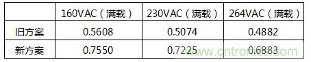 图1:填谷电路输入电流波形以下所有表中旧方案为采用电解电容的产品,新方案为采用填谷电路无电解电容的新产品
