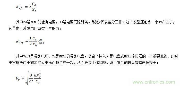 其中Fin(s)是输入的力(在使用陀螺仪时是科里奥利力,在使用加速度计时是由于输入加速产生的力)。x(s)是传感器质量块对应输入力的位移。m是质量块的质量,D是阻尼系数,k是弹簧常数(刚度)。MEMS传感器的工作原理基于这样一个事实:给MEMS施加一个输入力(Fin)将产生一定的位移,进而改变MEMS电容(Cout)。这个Cout可以用连接MEMS单元的电路进行测量。带激励电极的MEMS传感器建模如图1所示。这个模型的增益是Kx/c,代表由于MEMS质量块位移引起的输出电容变化。Kx/c等于: