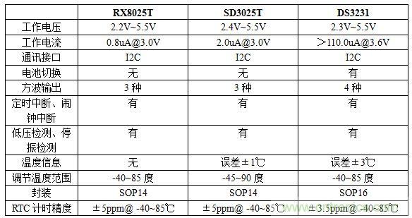 现在市面上常用的带温度补偿RTC芯片有EPSON公司的RX8025T芯片,Maxim公司的DS3231芯片和SDIC公司的SD3025T芯片等。下表对比3种芯片的主要差异:
