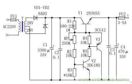 此稳压电源可调范围在3.5V~25V之间任意调节,输出电流大,并采用可调稳压管式电路,从而得到满意平稳的输出电压。工作原理: 经整流滤波后直流电压由R1提供给调整管的基极,使调整管导通,在V1导通时电压经过RP、R2使V2导通,接着V3也导通,这 时V1、V2、 V3的发射极和集电极电压不再变化(其作用完全与稳压管一样)。调节RP,可得到平稳的输出电压,R1、RP、R2与R3比值决定本电路输出的电压值。元器件选择: 变压器T选用80W~100W,输入AC220V,输出双绕组AC28V。FU1选用1A,FU2选用3A~5A。VD1、 VD2选用 6A02。RP选用1W左右普通电位器,阻值为250K~330K,C1选用3300μF/35V电解电容,C2、C3选用0.1μF独石电容,C4选用 470μF/35V电解电容。R1选用180~220Ω/0.1W~1W,R2、R4、R5选用10KΩ、1/8W。V1选用2N3055,V2选用 3DG180或2SC3953,V3选用3CG12或3CG80