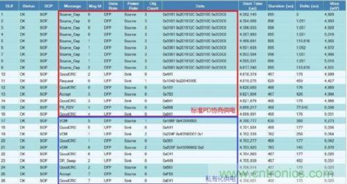 为了更加有效开发和准确验证基于控制流程的协议沟通,本文采用赛普拉斯研发的PD协议分析仪CY4500 EZ-PD™ Protocol Analyzer。CY4500 协议分析仪通过抓取配置通道(CC,Configuration Channel)上的数据包,并通过USB接口发送到主机端,通过软件EZ-PD Analyzer Utility解码并显示PD协议包。CY4500不仅可以实时显示并解析PD通信包,而且还实时测量电力传输过程中的电压和电流值,进而缩短了开发周期,对于调试以及兼容性测试帮助非常大。