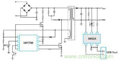 典型的手机充电器的硬件结构(以基于Dialog方案的高通QC2.0快充协议为例)如图 1所示。iW626作为QC2.0协议控制器,经由USB口的D+/D-信号和手机侧AP进行供电协商,然后通过光耦控制原边的AC/DC控制器iW1780完成输出电压的调整。