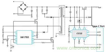 基于PD协议的充电器电路可以维持AC/DC部分不变,只是将QC协议控制器替换为PD控制器[1],比如Cypress半导体的CCG2(Type-C Controller Generation 2). CCG2 是最早通过USB-IF认证的PD控制器之一,内部包含ARM® Cortex®-M0处理器和完备的PD协议收发器,可以满足充电器,主机,附件,EMAC线缆等各种支持Type-C口的应用,在苹果,联想,HP,Dell,小米,乐视等一线品牌客户都有众多的量产案例。