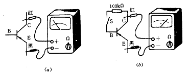 用万用表的R×1k(或者R×100)档。如果测PNP型管,按图6-2-5 所示的电路连接。如果测NPN型管,红、黑笔对调。对比开关S在 接通和断开时测得的电阻值,两个读数相差越大,表明晶体管的β值越高。图中的100kΩ的电阻和开关S,可以用潮湿的手指捏住电极和 基极代替。注意不要让极电极和基极碰在一起,以免损坏晶体管。