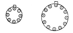 圆型集成电路芯片给出的是底脚图。一般在其外壳上有一个突出物,由它标明最大管脚序号所在位置,起它管脚序号的排列方法有的是按逆时针方向排序,也有的是按顺时针方向排序(参阅厂家产品说明书)。如图6-3-2 所示。