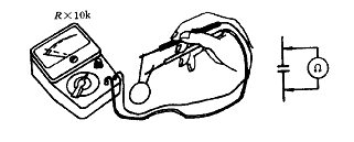 ①固定电容器(非电解电容器)漏电电阻的检测。根据电容器的充放电原理,可用万用表R×1K或R×10K挡(视电容器的容量而 定)测量。测量时,将两表棒分别接触电容器(容量大于0.01微法)的两引线,如图6-1-6所示。此时,表针会迅速地顺时针方向跳动或 偏转,然后再按逆时针方向逐渐退回“∞”处。如果回不到“∞”,则表针稳定后所指的读数就是该电容器的漏电电阻值。一般,电容器的 漏电电阻很大,约几百到几千兆欧。漏电电阻越大,则电容器的绝缘性能越好。若阻值比上述数据小得多,则说明电容器严重漏电,不能使 用;若表针稳定后靠近“O”处,说明电容器内部短路;若表针毫无反应,始终停在“∞”处,说明电容器内部开路。
