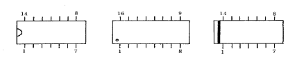 双列直插式集成电路一般给出顶式管脚图。芯片上以缺口、小原点或竖线等标记出管脚“1”的位置。如图6-3-1中,左下第一脚即为1管脚,此后管脚号按逆时针方向排序。