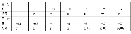 精度误差:普通电阻误差等级分别用Ⅰ、Ⅱ、Ⅲ表示+5%,+10%、+20%,精密电阻的误差等级的符号表示方法见表6-1-6。