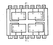 LM324内含4个独立的高增益、频率补偿的运算放大器;既可单电源使用(3~30V),也可双电源使用(+1.5~+15V),驱动功耗低;可与 TTL逻辑电路相容。其管脚图如图6-3-4所示。